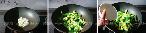 4.鍋里面放植物油,6成熱,放入蒜蓉爆炒出香味,放入西蘭花胡蘿卜翻炒
