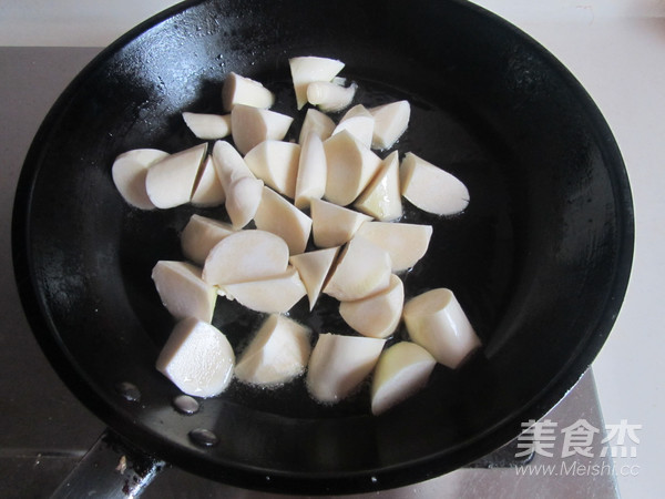 熱鍋涼油, 放入茭白進(jìn)去翻炒;