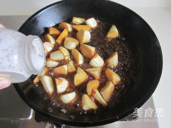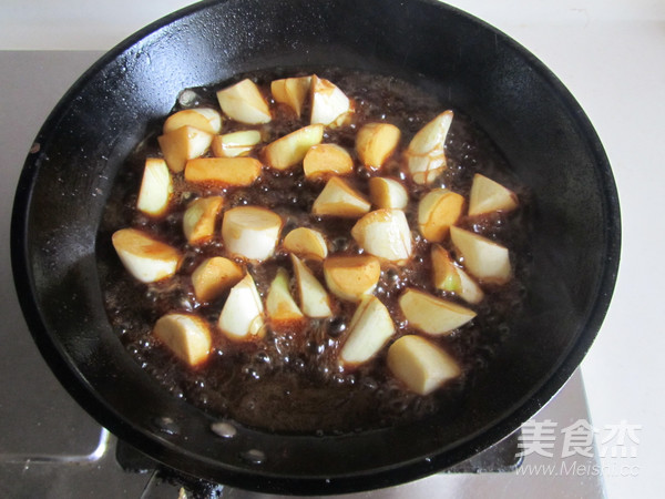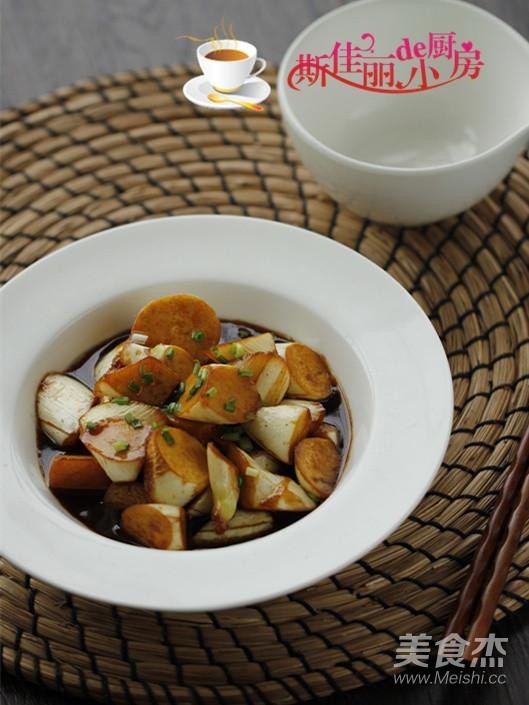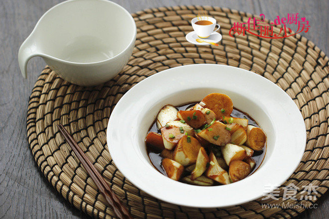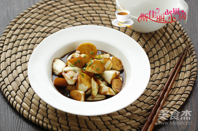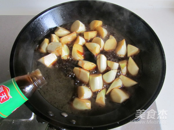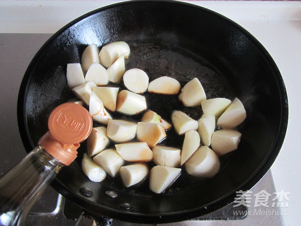 1. 茭白切成滾刀塊; 2. 用蠔油、黃酒和生抽一起燉煮,因?yàn)檫@都有些咸味,所以后面加入鹽的量要少點(diǎn)。