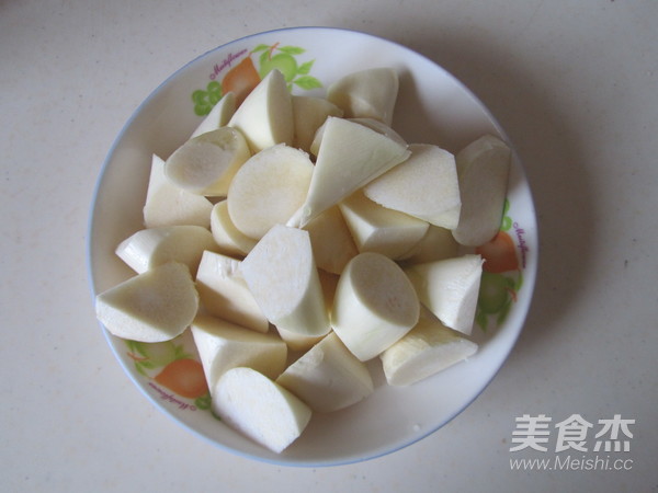 準(zhǔn)備好原料, 茭白切成滾刀塊;