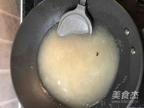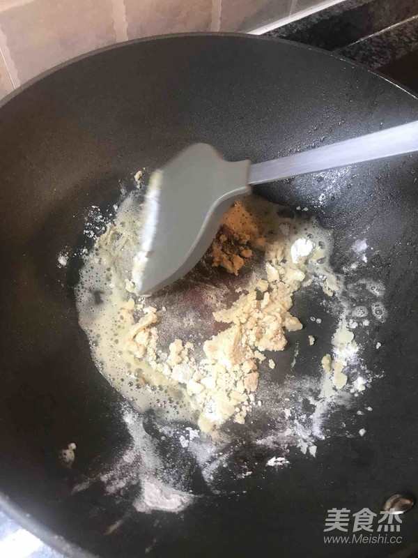 4.鍋熱后~放入黃油和面粉。轉小火攪拌均勻。(如果大家喜歡喝粘稠一些的,這一步時候可以適量多一些面粉。但是切記攪拌均勻,不然就是疙瘩湯了)