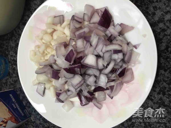 6.將之前炒好的洋蔥+蘑菇放入鍋中。加入適量的淡奶油。并攪拌均勻。