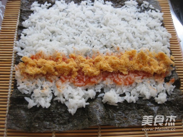 2、米飯平鋪在紫菜上面,注意首尾留一點(diǎn)空,不要鋪太滿了,不然卷的時(shí)候會(huì)擠出來。