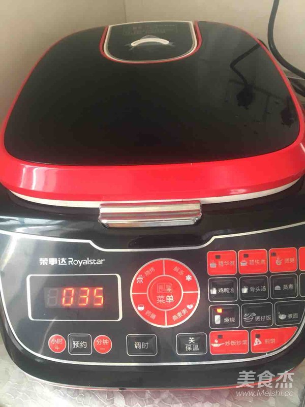 五花肉放入鍋內,加入姜絲八角桂皮,料酒,生抽,老抽,鹽,糖,翻拌均勻,蓋上鍋蓋,選燜燒功能。35分鐘后即可品嘗美食了。