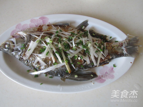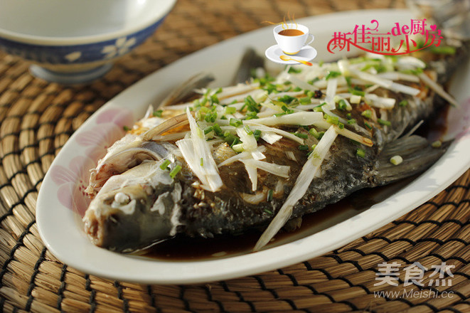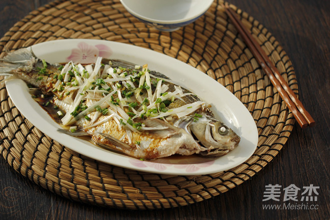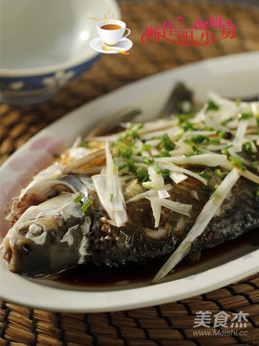 1. 武昌表面劃上幾刀后加入鹽和料酒涂抹,腌制一下; 2. 蒸魚時將姜片放在魚的表面上; 3. 這魚大約一斤重, 蒸上八分鐘; 4. 魚蒸好后去除姜片, 趁熱澆淋上蒸魚豉油; 5. 最后將燒熱的花椒油澆淋在鋪上大蔥和小蔥的魚身上。