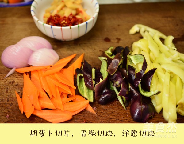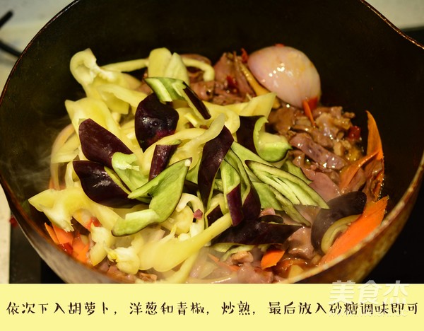 依次下入胡蘿卜,洋蔥和青椒,炒熟,最后放入砂糖調味即可