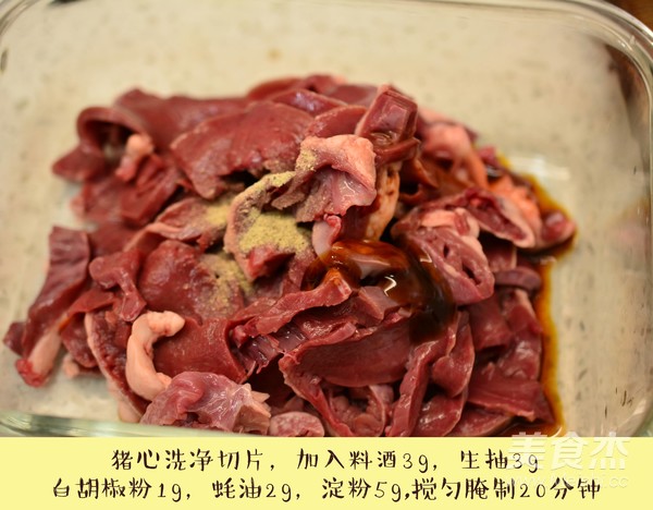 豬心洗凈切片,加入料酒3g,生抽3g,白胡椒粉1g,蠔油2g,淀粉5g腌制20分鐘