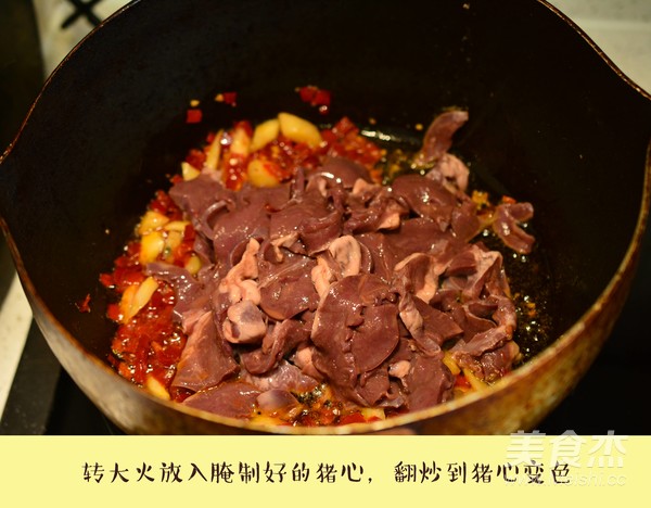 轉大火放入腌制好的豬心,翻炒到豬心變色
