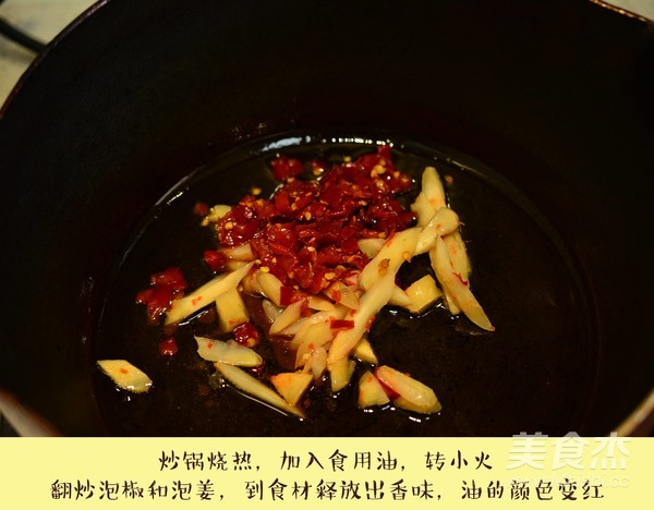炒鍋燒熱,加入食用油,轉小火,翻炒泡椒和泡姜,到食材釋放出香味,油的顏色變紅