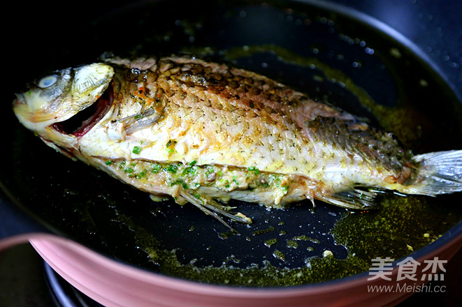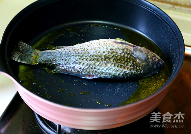 垂直放入鯽魚,小火慢煎,中間時(shí)不時(shí)晃動(dòng)一下