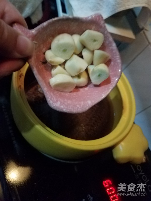 在把大蒜去皮,每瓣切兩瓣即可,倒入砂煲內。