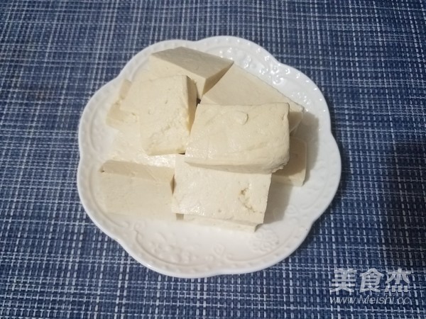 豆腐洗凈,切成三四厘米大小的長方塊,用開水燙一下。
