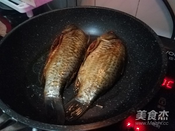 把鯽魚放進鍋內,中小火慢慢煎一下。