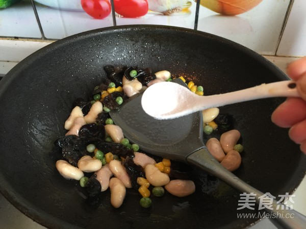 加入泡好的黑木耳繼續炒勻,加點鹽調味