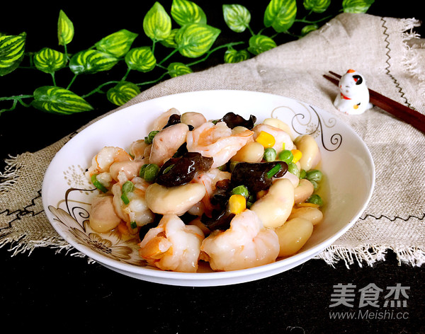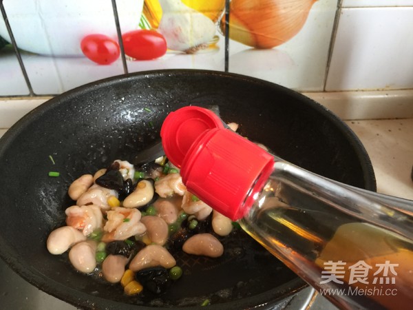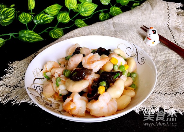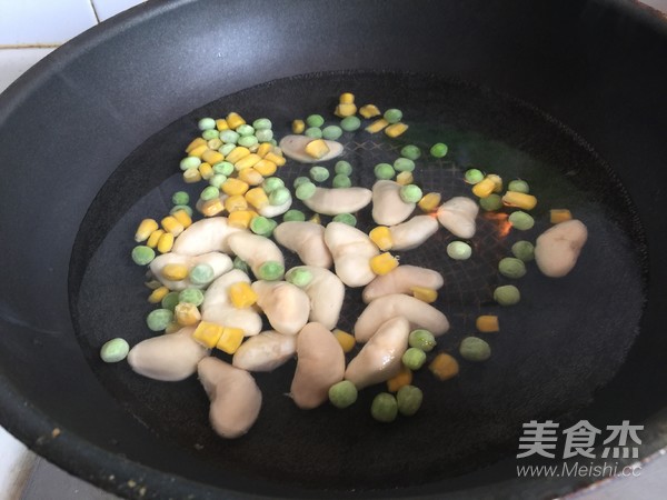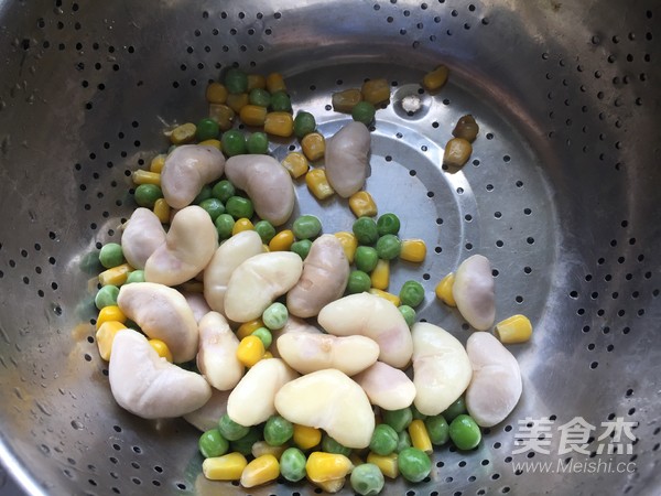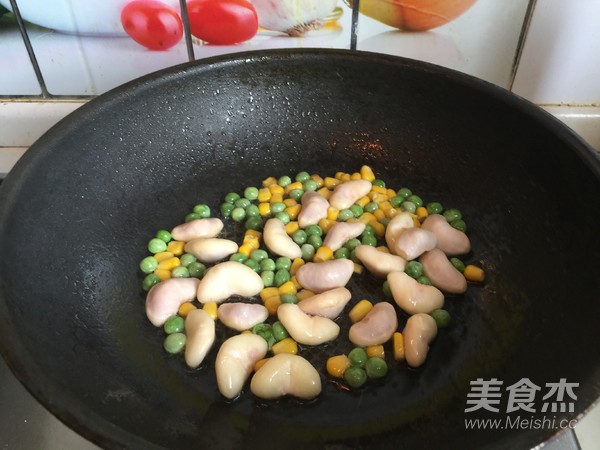鍋中留底油,放入焯水后的雜蔬粒和菱角米翻炒