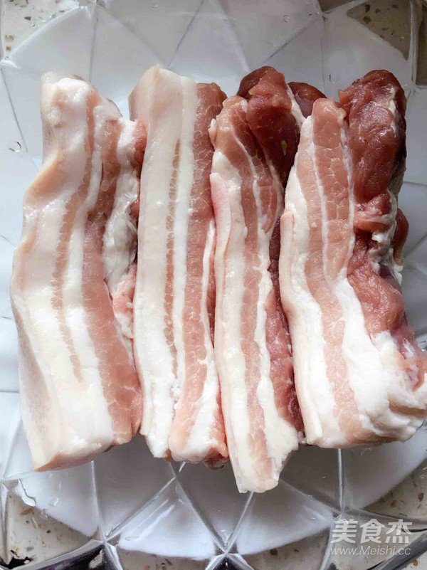 1.將帶皮五花肉洗凈切成5厘米左右厚的長條。