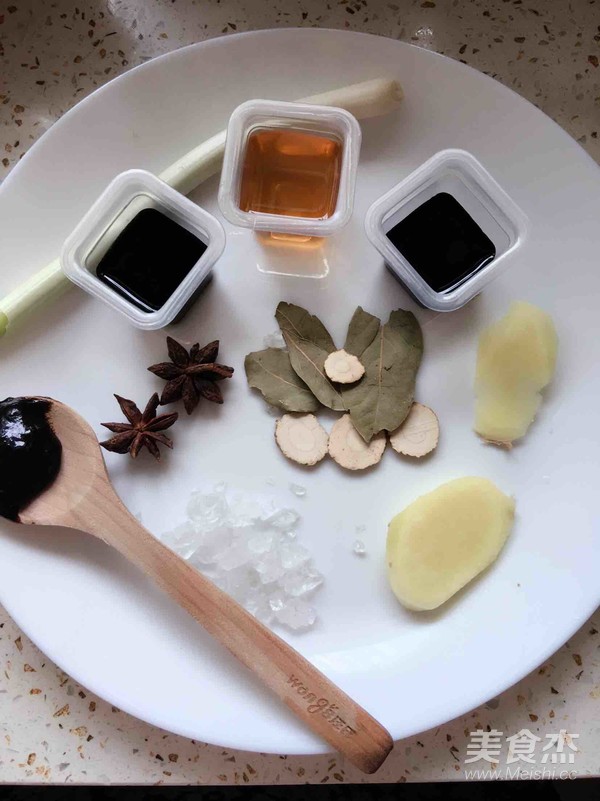 2.準(zhǔn)備香蔥,生抽醬油,老抽醬油、黃酒,面醬,大料、香葉、白芷,姜片和冰糖。