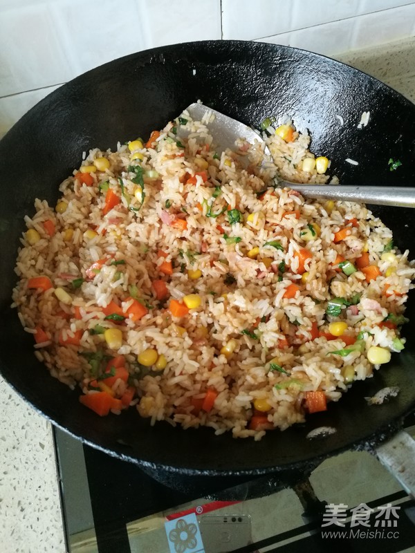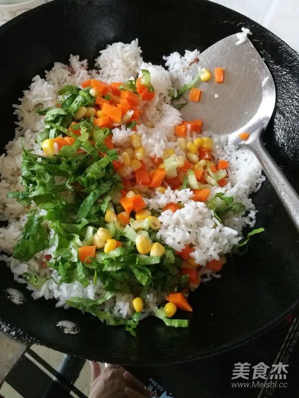 8、倒入玉米胡蘿卜丁,加入切碎的麥菜末,翻炒。