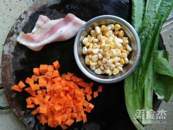 1、玉米瓣下成粒,胡蘿卜洗凈切丁,麥菜洗凈,培根備好