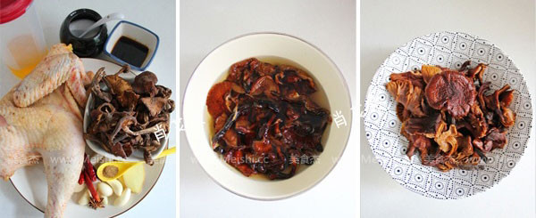 1.準(zhǔn)備食材,干榛蘑用流水沖去表面的浮土,然后用溫水浸泡20到40分鐘,然后擠凈水分,用廚用剪刀剪去硬根