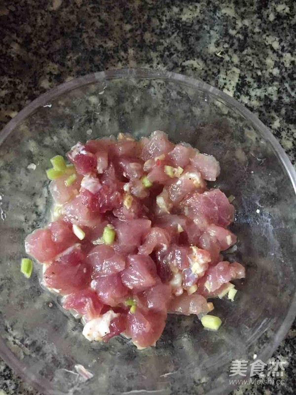 3.肉切丁,加食用油、鹽、胡椒粉、料酒、姜蔥末和生粉拌勻腌制片刻