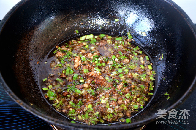 2.將五花肉切碎在鍋中包出油來(lái),倒進(jìn)蔥姜蒜,十三香。