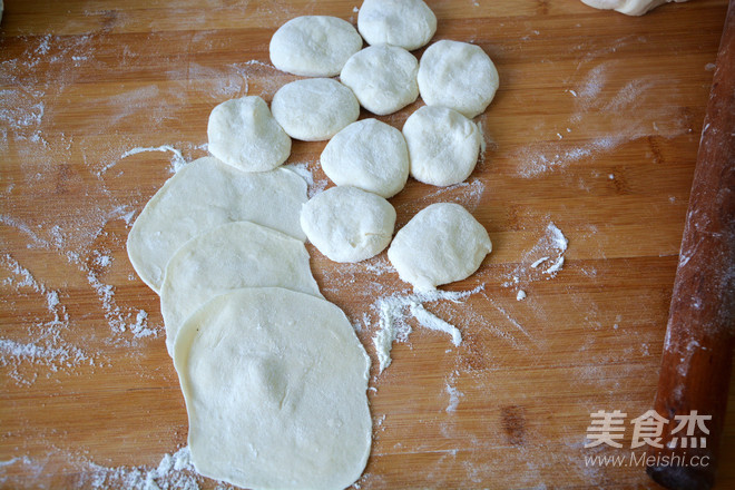 5.將面團(tuán)揪成均等的小劑子,搟成圓形中間厚四邊薄的的面片。