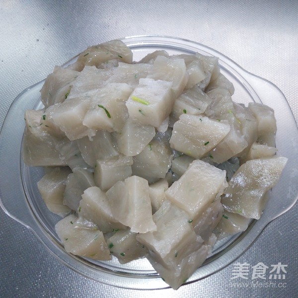 山芋粉300克,用水泡上半天,泡好后倒去表面的水。鍋里放3碗水燒開,鍋里放少許鹽,蔥花,把沉淀的粉糊攪拌均勻,倒入鍋里用鏟刀不停的攪拌,至呈透明狀凝固即可關火,倒在淺些的盤子里,這樣容易冷卻。圖片上制作好的大粉。