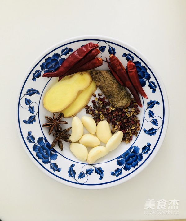 在腌制雞肉的時候準備炒料: 一把大紅袍花椒,一段桂皮,兩片姜片,兩塊八角,六個干朝天椒,七整塊蒜粒