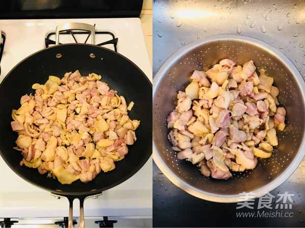 此時燒半壺水供下一步使用. 現在往三分熱的鍋里加入少量植物油,大火燒至七分熱后加入腌制好的雞肉進行翻炒大約5~8分鐘. 待雞肉表面變白即可撈出過濾待用. 注意:撈出雞肉后不用洗鍋,因為鍋里全是雞肉的香味,不洗鍋炒能讓這盤雙椒雞的味道更加清香地道