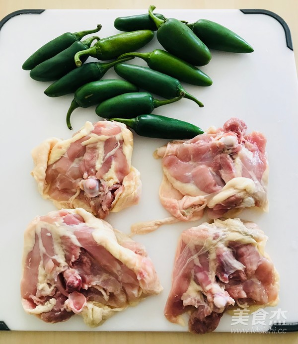 四塊雞大腿肉,200克左右青辣椒(多少根據想吃的辣度進行調整). 我這里用的是哈雷派尼奧青椒(Jalape?o Pepper), 因為在美國這種青辣椒很辣而且跟國內的很像