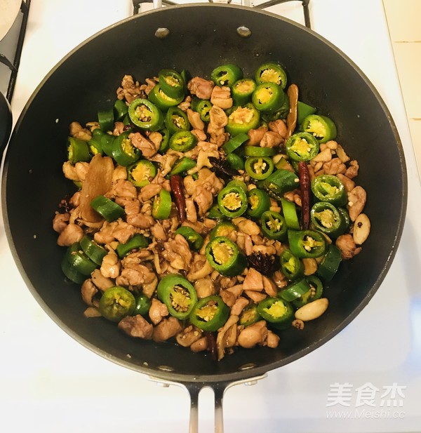 揭開鍋蓋,轉至大火收汁5~8分鐘,加入準備好的青辣椒進行翻炒8~10分鐘,其間試吃雞肉,根據咸淡口味加入適量的鹽,挑出八角和桂皮,然后將雞肉轉移盤中. 完成