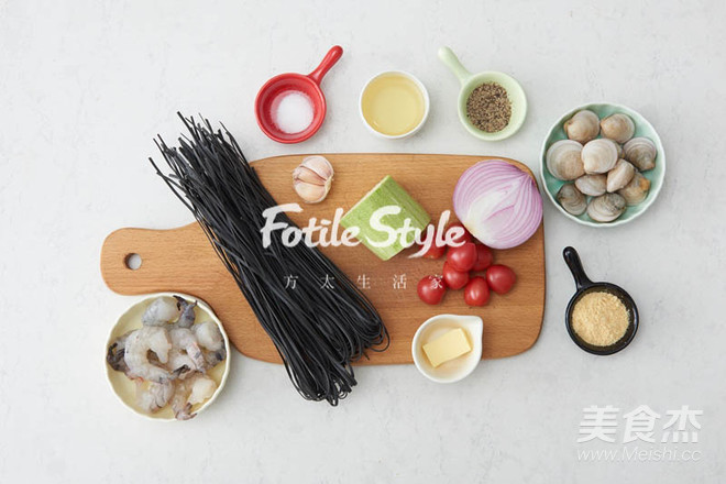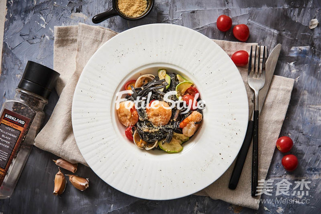取一口湯鍋,燒開水后放入墨魚汁面,轉中火煮5分鐘(根據面的粗細可改動)