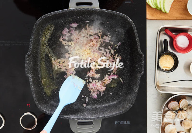 取一個炒鍋,放入黃油,黃油融化后,倒入蒜末和洋蔥碎炒香