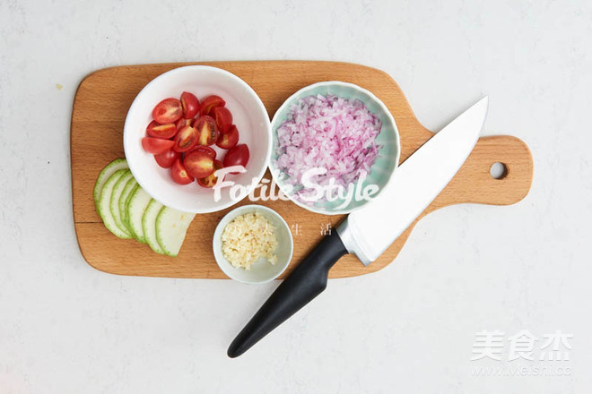 西葫蘆切片,小番茄對切,蒜瓣切成蒜末,洋蔥切碎丁備用