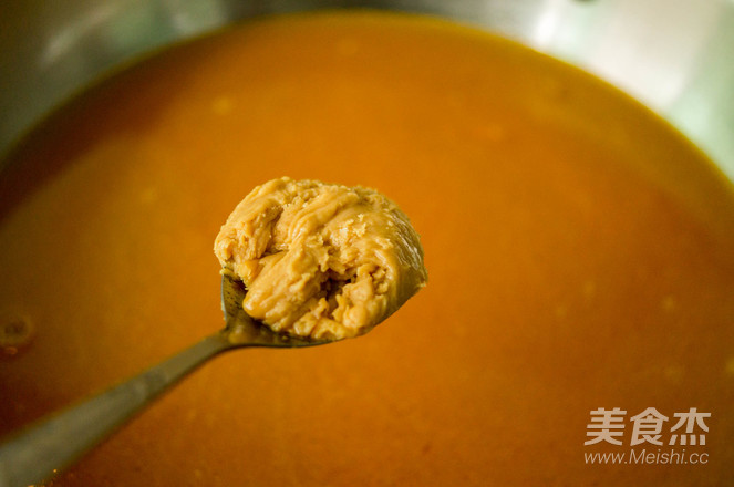 3.放入沙茶醬同炒一下,炒勻以后加水,注意,沙茶醬和花生醬的比例是2:1