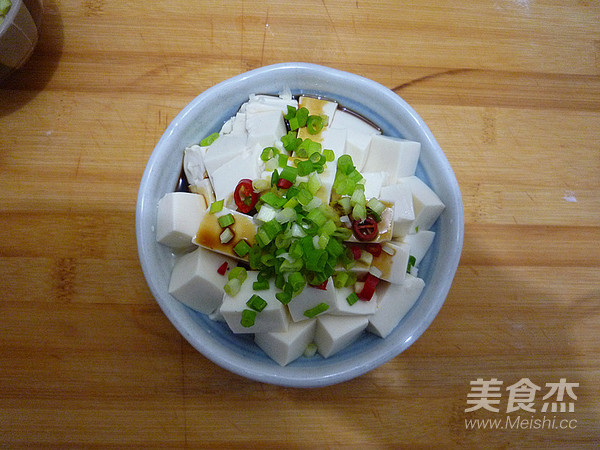 蒸好的豆腐取出,倒去蒸出來的湯汁。