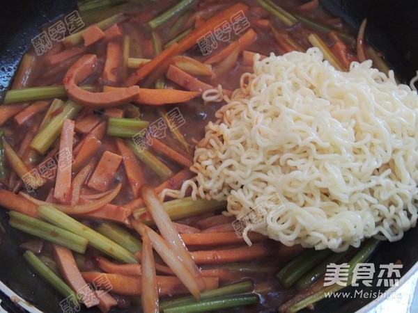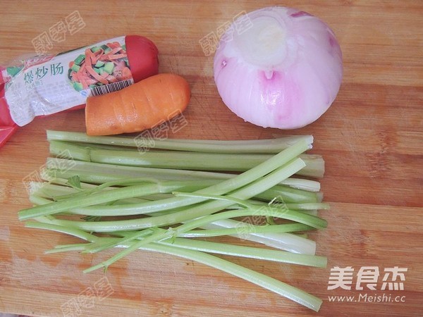 芹菜、洋蔥、胡蘿卜、爆炒腸分別切絲