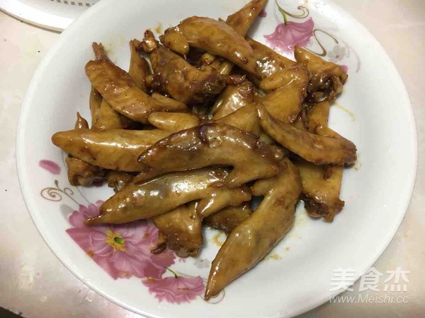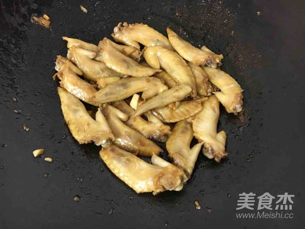 鍋熱放油把雞翼尖翻炒幾下變顏色了就放蒜頭和姜,然后放點(diǎn)鹽,倒入少量水,放點(diǎn)醬油悶熟透