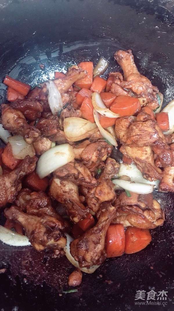 ?鍋底加入花生油,放入雞翅根炒至微黃后加入料酒、醬油、大料、少許水翻炒至變色