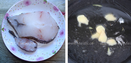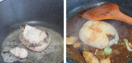 2.鍋里放花生油至六成熱,下魚塊,煎至兩面微黃,下蔥姜