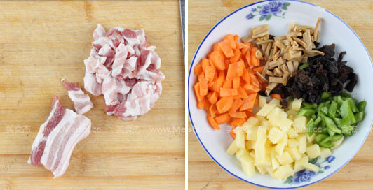 2.五花肉切小西片,比指甲蓋大一點就可以了,胡蘿卜、土豆、柿子椒、木耳、黃花菜分別切小丁備用
