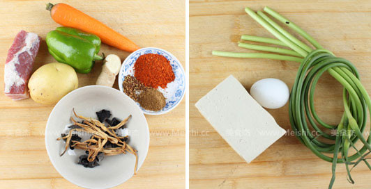 臊子配料:土豆1個、胡蘿卜1根、柿子椒1個、蒜苔6根、豆腐1塊、黃花菜20克、木耳20克、五花肉250克、雞蛋1個
