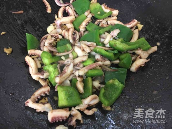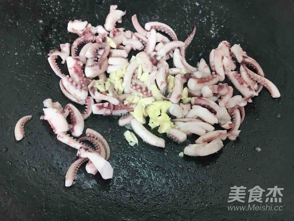 4.鍋熱后倒入油,把魷魚放進(jìn)鍋里翻炒干水