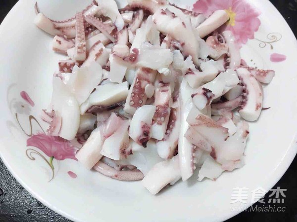 2.魷魚灼水,清理干凈,切塊(可以灼熟點(diǎn)等下炒的時(shí)候不用怕不熟,當(dāng)然了也不用太久,會(huì)老)