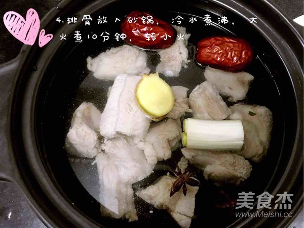 排骨放入砂鍋中,冷水煮沸,大火煮10分鐘,轉(zhuǎn)小火