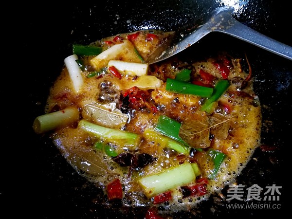 5.鍋內留適量的油,依次入花椒,干辣椒,姜片,大蔥,香葉,桂皮,八角,茴香籽小火煸香,再放入豆瓣醬炒香!