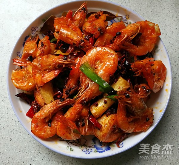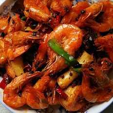 6.炒香后放入炸好的大蝦快速翻炒,依次放入料酒,白糖和雞精提鮮提香!