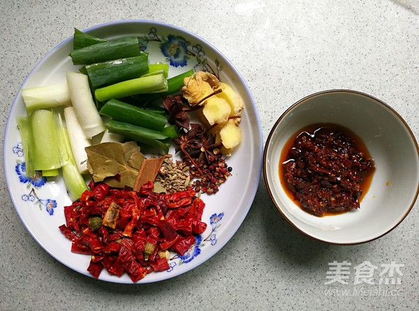 2.姜切大片,蔥切大段,辣椒切段,準備花椒,桂皮,香葉,茴香籽,還有少許豆瓣醬!