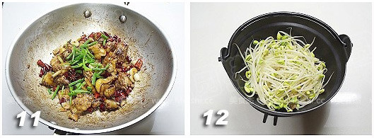 10.干鍋在火上加熱,放入少許油,放入黃豆芽加少許的鹽,慢火炒至黃豆芽斷生